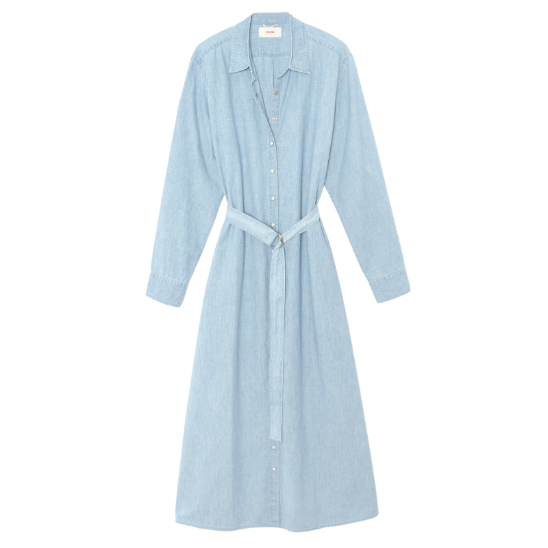 The Bowen dress epitomizes easygoing elegance. The classic shirt silhouette is crafted from 100% cotton chambray in a washed blue hue and cinches at the waist with a self-tie rope belt, defining the relaxed fit. Take it into winter with boots and a coordinating leather belt.