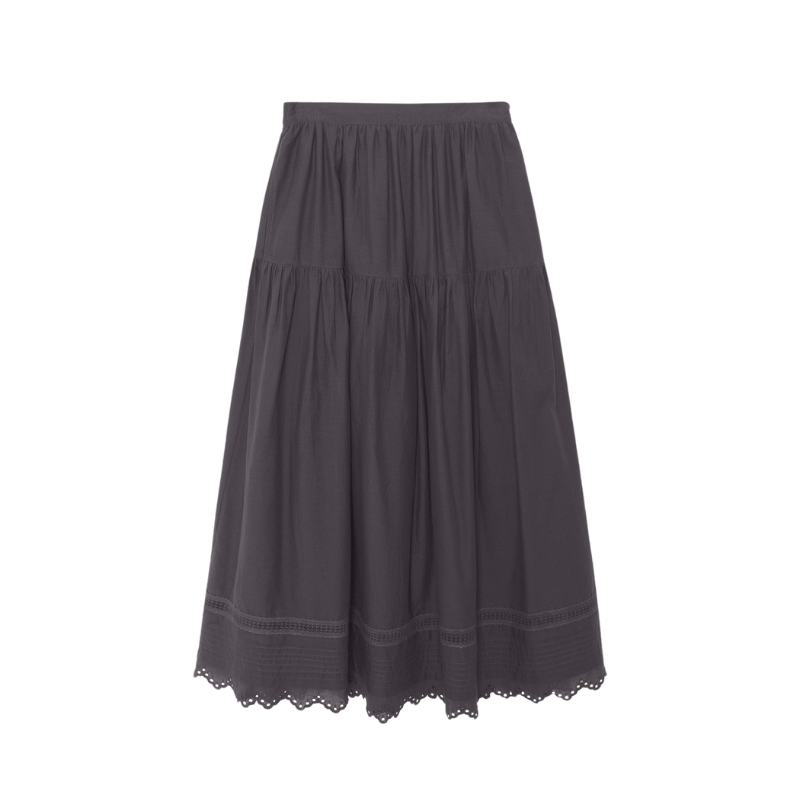 This midi skirt has pintuck details and a scalloped eyelet hem.